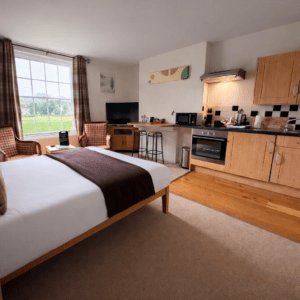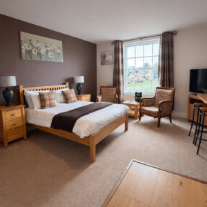 The Arlingham Suite – This suite offers a view over the garden, a double bedroom, bathroom with shower, separate lounge with sofa bed, television, wi-fi and self catering kitchenette area. Two entrances for easy access to the neighboring Framilode Room.